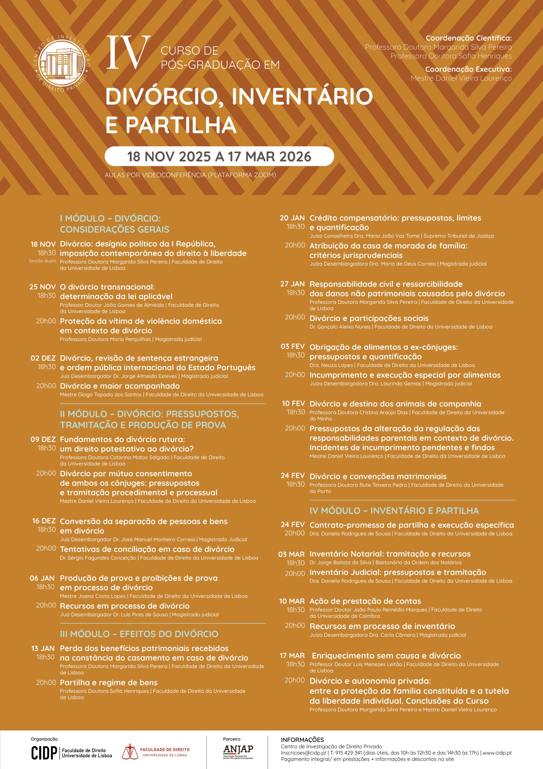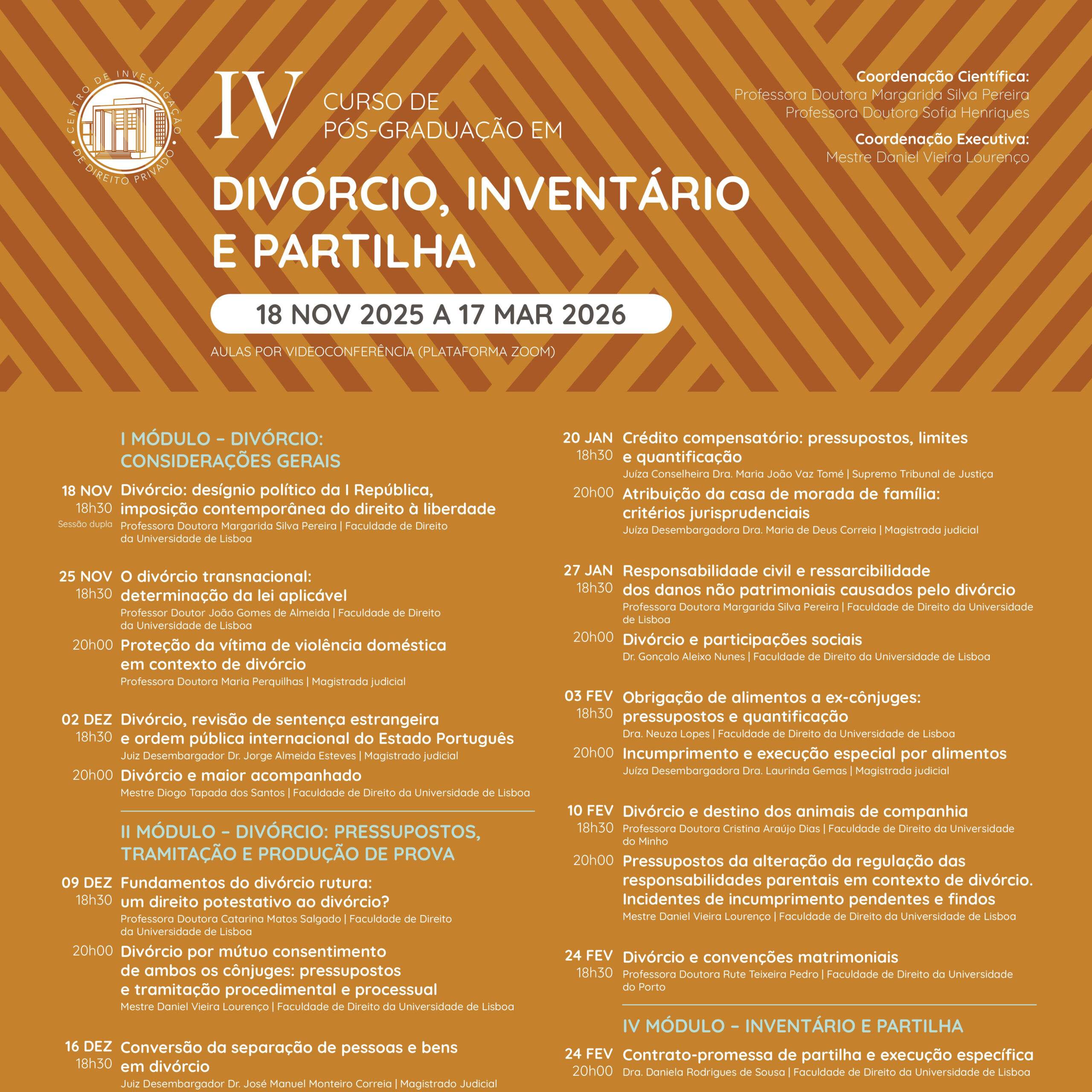 O Curso de Pós-Graduação em Divórcio, Inventário e Partilha destina-se a licenciados em Direito e áreas científicas conexas.