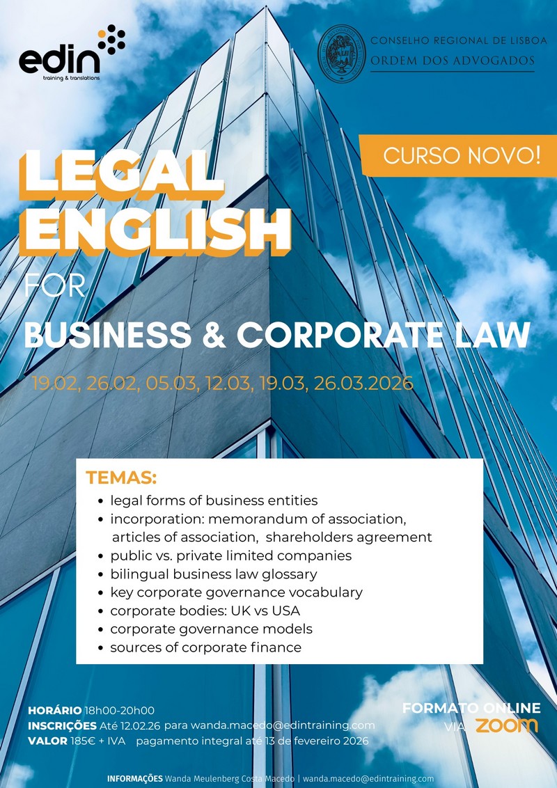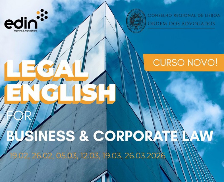 O Conselho Regional de Lisboa e a Edin Training & Translations promovem um novo curso de formação de Inglês Jurídico: o curso Legal English for Business & Corporate Law, em formato online, dedicado ao vocabulário do direito empresarial & societário e do governo societário (corporate governance).