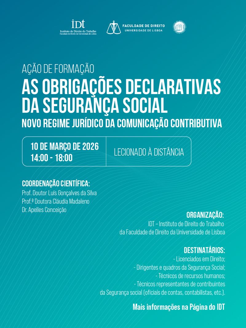 Para qualquer esclarecimento, pode contactar-se o Instituto de Direito do Trabalho (idt@fd.ulisboa.pt) / www.idt.fdulisboa.pt / 965 392 128.